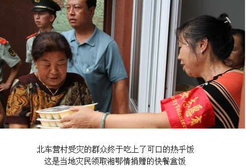 北車營(yíng)村村長(zhǎng)翟瑞生說,“村民已吃了近一周的方便面,湘鄂情送來的飯菜讓大家特別高興,終于可以換換口味,品嘗到新鮮可口的熱飯熱菜了。”
