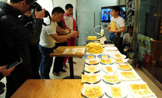 2016年4月19日,在黃太吉外賣平臺與眾多知名餐飲公司入駐簽約儀式中,由清華學(xué)霸創(chuàng)業(yè)的三弟畫餅團(tuán)隊,用他們研發(fā)的3D煎餅打印機(jī),為現(xiàn)場知名餐飲企業(yè)打印了帶有LOGO的個性化煎餅,引發(fā)眾人圍觀。