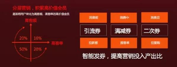只要商家接入了平臺,口碑就能整合阿里巴巴集團各個渠道的數(shù)據(jù),比如高德地圖、滴滴等平臺的LBS數(shù)據(jù),淘寶的類目偏好數(shù)據(jù),支付寶的消費能力數(shù)據(jù),再加上口碑在菜品方面的數(shù)據(jù),以這些消費行為數(shù)據(jù)為基礎,用算法幫助商家自動生成一對一的營銷方案。