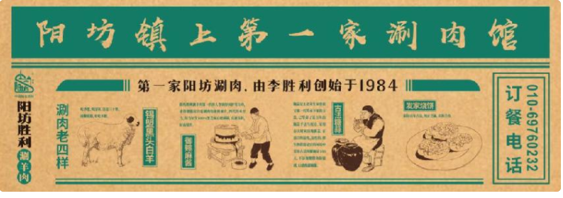 首先確定了陽坊鎮(zhèn)老店的門頭上的品牌故事:第一家陽坊涮羊肉由李勝利創(chuàng)始于1984,強調(diào)“陽坊涮羊肉,勝利才正宗”。