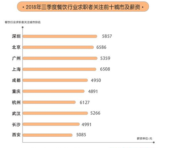 58同城的報告則顯示,2018年第三季度餐飲業求職者關注的前十城市分別為深圳、北京、廣州、上海、成都、重慶、杭州、武漢、長沙、西安,北上廣深四大一線城市成為最受歡迎的城市。
