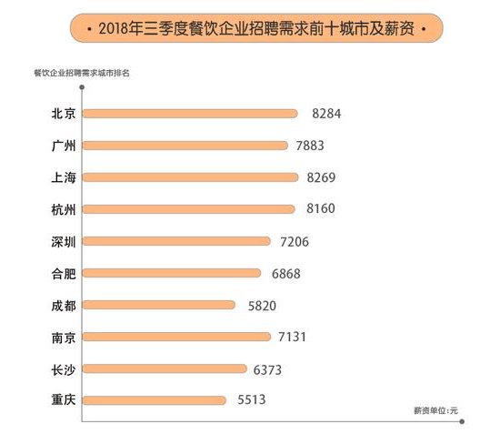 這份報告的數據來看,今年第三季度餐飲企業招聘需求量前十城市依次為北京、廣州、上海、杭州、深圳、合肥、成都、南京、長沙、重慶,北上廣包攬了餐飲企業招聘需求量的前三名。